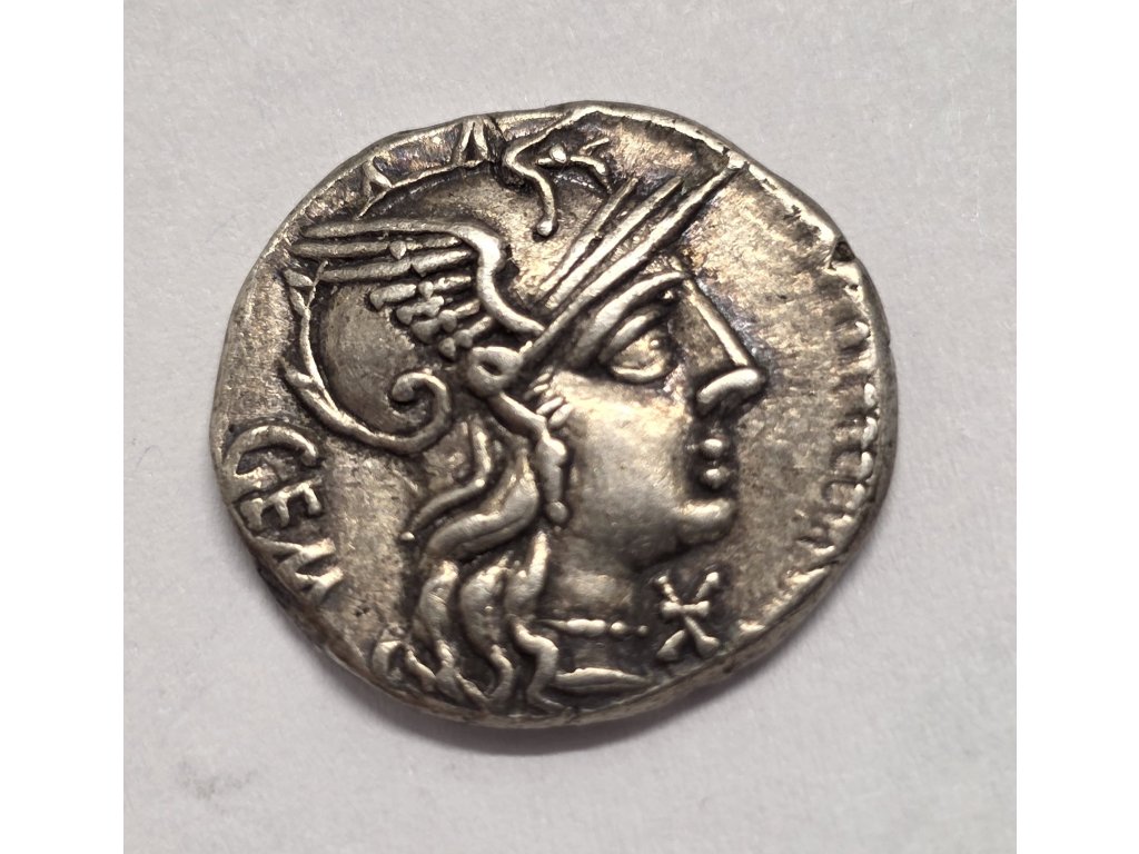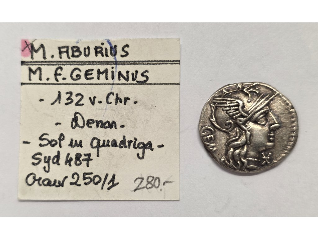 M.Aburius Geminus, Denár, Rím 132 p.n.l., krásna patina, EF