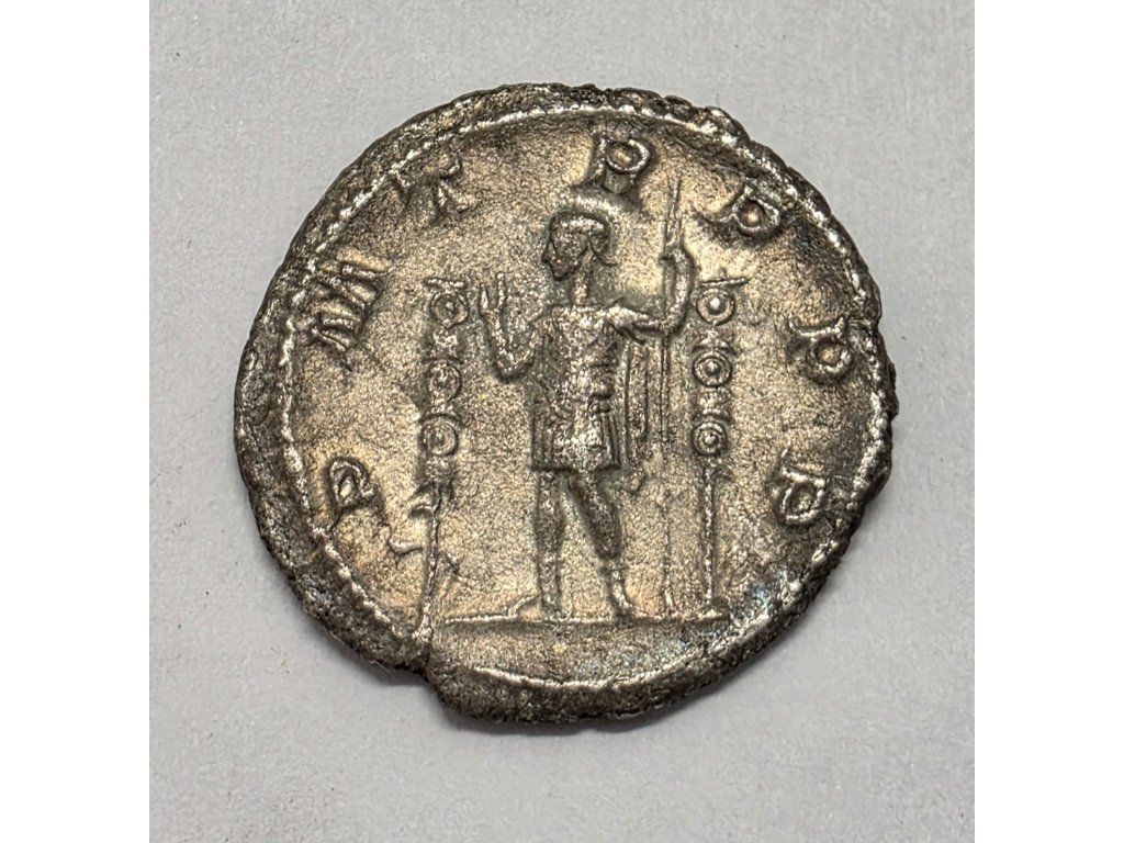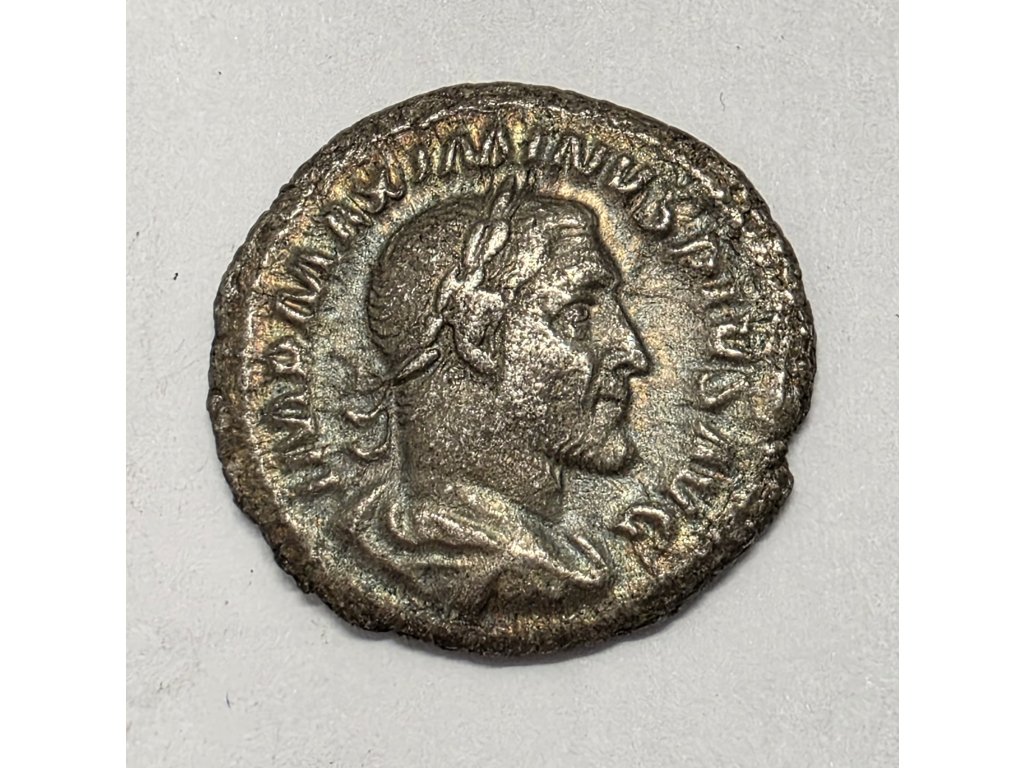 Maximinus I. Thrax 235-238 n.l., Denár, P M TR P P P, Maximinus I. stojaci medzi dvoma štandardami, krásna patina, gVF