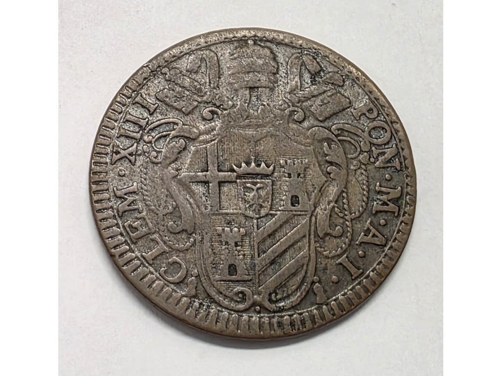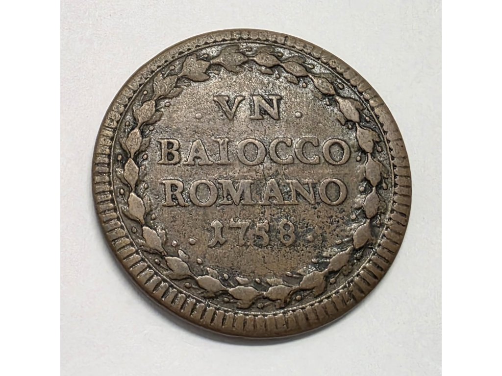 Pápežský štát-Vatican, Clement XIII. 1758-1769, 1 Baiocco 1758, krásna patina, gVF